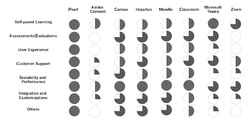 A comparative study of iPearl.ai against Canvas, Impartus, Moodle, Google Classroom, Microsoft Teams, and Zoom was conducted. Features in the following categories were compared: